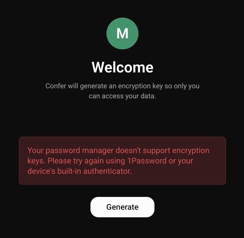 Confer.to site sign up sends email with link. The link opens confer.to to generate keys. Clicking Generate button prompts to save passkey to enpass but when attempting to save the confer.to site gives the following error "Your password manager doesn't support encryption keys. Please try again using 1Password or your device's built-in authenticator."