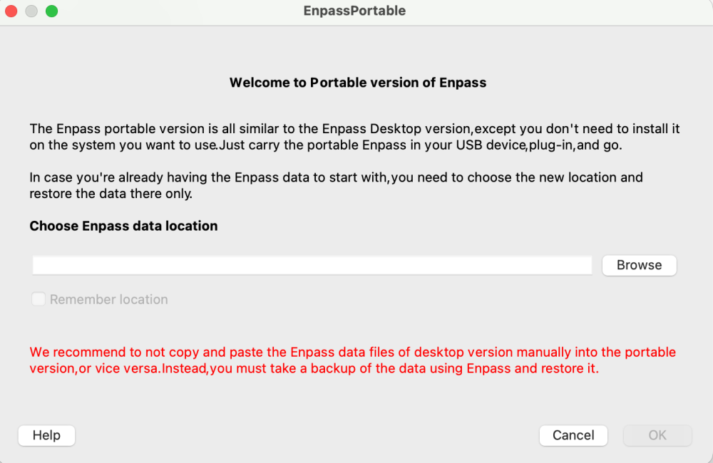 I found a workaround for Mac users that works for me. I copied the EnpassPortable app to a USB stick formatted as Mac OS extended. Previously, I double-clicked on EnpassPortable in Finder and got the error message “Unable to run app from current location...”. Here's how I was able to start EnpassPortable. I started a terminal and moved the working directory to the USB stick. In my case, “/Volumes/Volume,” so: cd /Volumes/Volume and then open EnpassPortable.app/. The above error message appeared when I started it for the first time. However, it no longer appears when I start it for the second time; instead, the Screenshot #2 screen appears. Here, I set the data location to /Volumes/Volume (my USB stick device), selected the Remember location checkbox, and confirmed with OK. And now the EnpassPortable app launches. To exit the app, please do not use the “red cross” but instead select Enpass -> Quit Enpass. This is the only way to exit the app properly. I hope this procedure works for other users as well. I "imported" a backup and noticed that restoring the vault took a very long time. I assume this is mainly due to the speed of the USB stick.